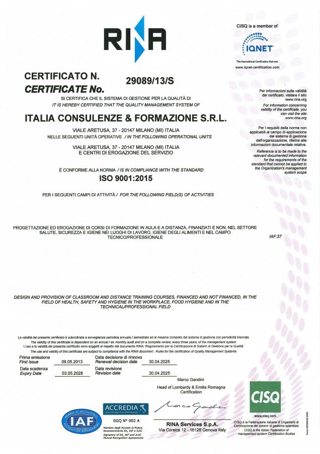 🔹 In merito ai corsi per Addetti alle Emergenze (Primo Soccorso ed Antincendio) ed H.A.C.C.P. il soggetto formatore è Italia Consulenze & Formazione s.r.l. in veste di centro di formazione dotato di Sistema di Gestione Qualità sui servizi formativi;