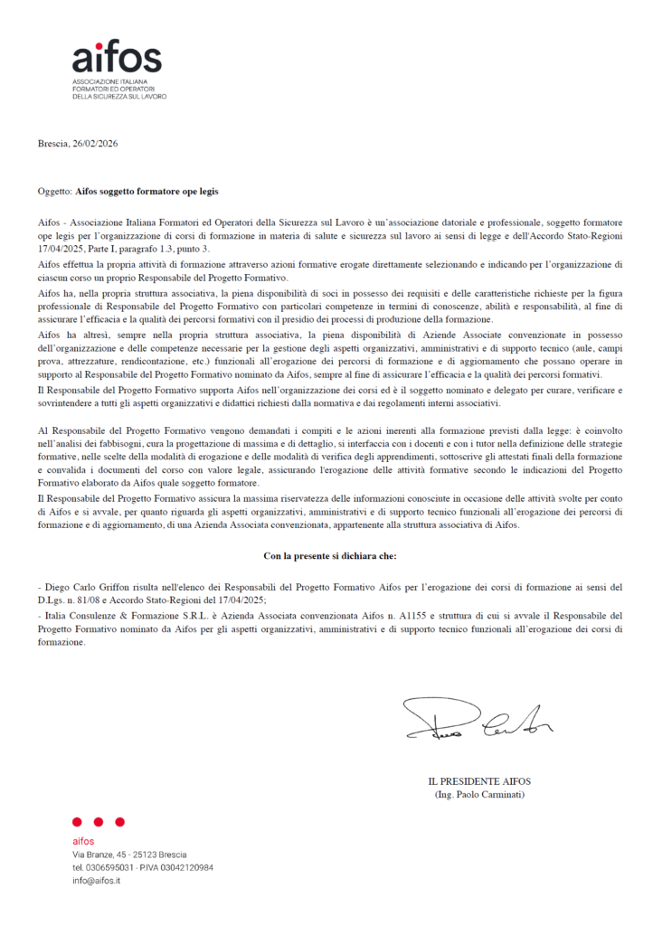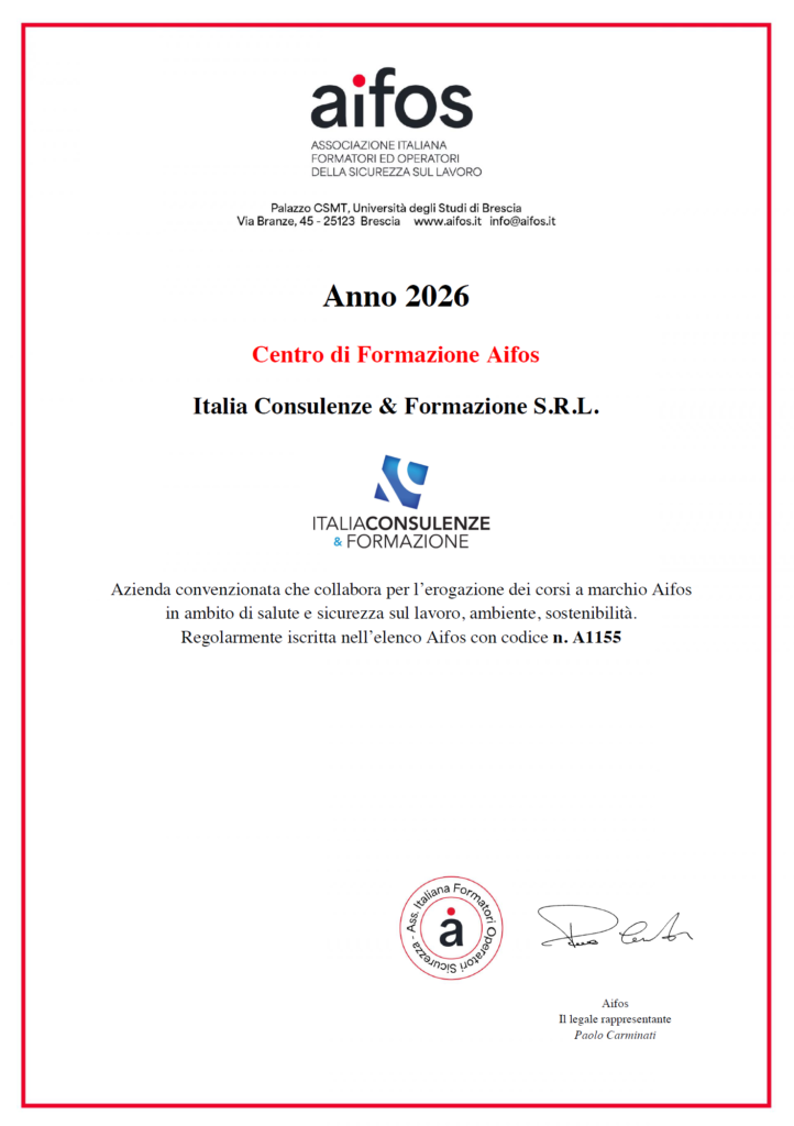 Italia Consulenze & Formazione s.r.l. è Azienda Associata convenzionata Aifos n. A1155 e, nell’ambito di tali corsi, si configura come struttura di cui il Responsabile del Progetto Formativo nominato da Aifos si avvale per gli aspetti organizzativi, amministrativi e di supporto tecnico funzionali all’erogazione dei corsi di formazione.